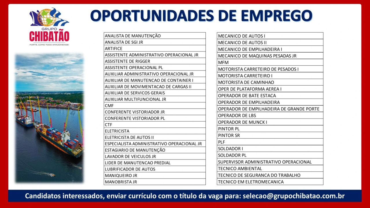 O Grupo Chibatão, uma das maiores empresas do Amazonas, está com 47 vagas de emprego abertas em Manaus. As oportunidades contemplam diversas áreas, como: operacional, administrativa, manutenção, mecânica, elétrica, segurança do trabalho, solda, pintura, logística e muito mais. Os interessados devem enviar currículo por e-mail, indicando o título da vaga no assunto. Para mais detalhes sobre como se candidatar, acesse a seção "Como se Candidatar a Vaga?".